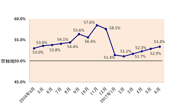 2017年6月内蒙古自治区物流业景气指数为53.4%