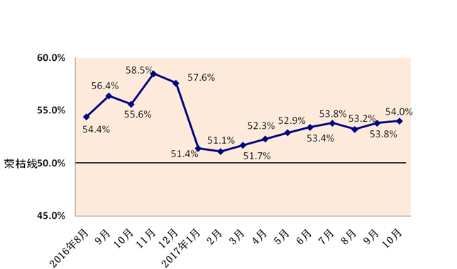 2017年10月内蒙古自治区物流业景气指数为54%