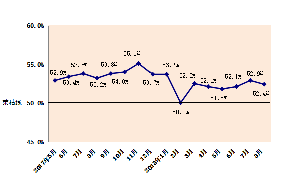 2018年8月,内蒙古自治区物流景气指数为52.4%,较7月回落0.5个百分点,高于全国平均水平1.7个百分点。受多雨天气影响,物流企业业务量略有减少。(见下图)