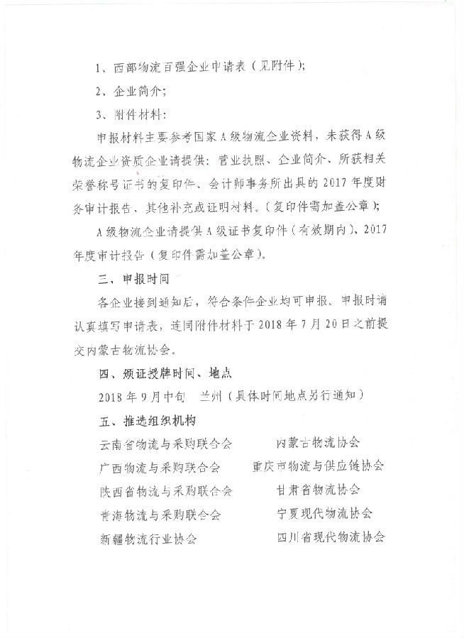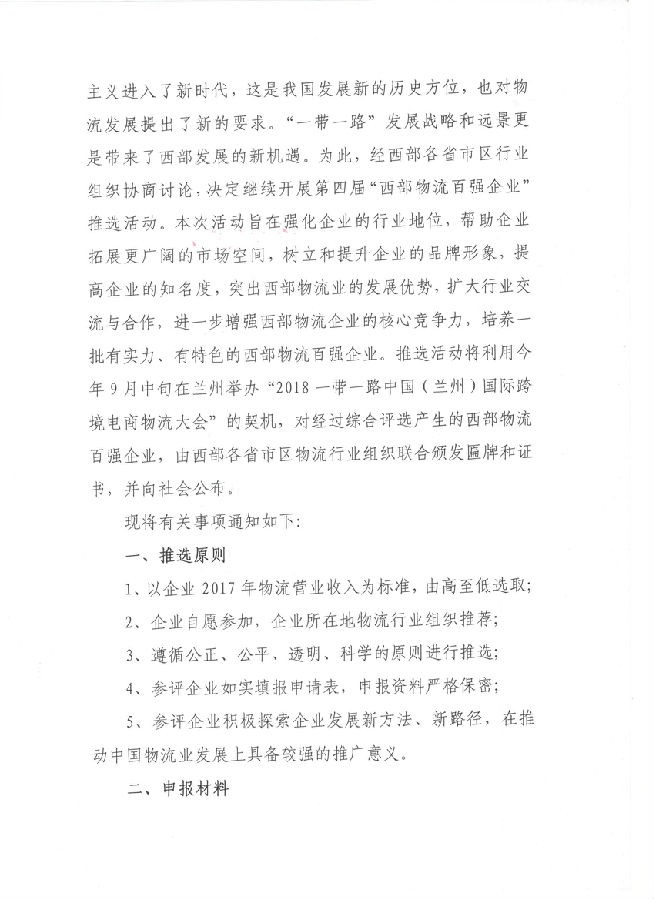 关于开展第四届“西部物流百强企业”推选活动的通知(川物协[2018]8号).doc
