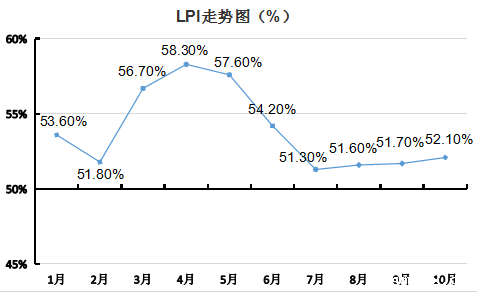 10月份,物流业景气指数较上月略有上升,仍保持在50%以上,全区物流活动仍保持增长态势,但增势缓慢。主营业务利润指数仍然位于50%以下,显示出物流企业效益整体偏弱,物流企业经营仍面临困难。