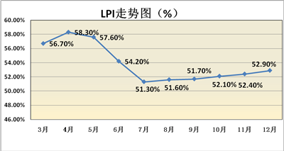 内蒙古自治区发展与改革委员会、内蒙古自治区统计局、taptap最大游戏共同调查的 2015年12月份全区物流业景气指数为52.9%,比上月回升0.5个百分点。各分项指数中,业务总量指数、库存周转次数、资金周转率、主营业务利润、主营业务成本与上月相比小幅回升;平均库存量、设备利用率、固定资产投资完成额、物流服务价格与上月相比基本持平;新订单量、物流从业人员指数较上月有一定程度的下降。